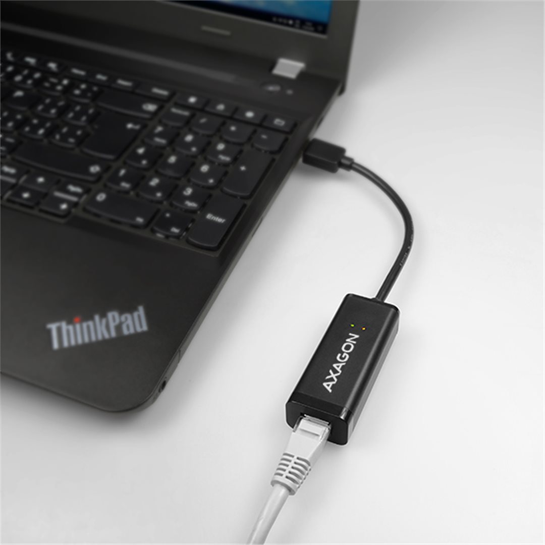 Kompaktní vysokorychlostní adapter AXAGON ADE-SR snadno přemění USB 3.0 port na Gigabit Ethernet 10/100/1000 Mbit port.