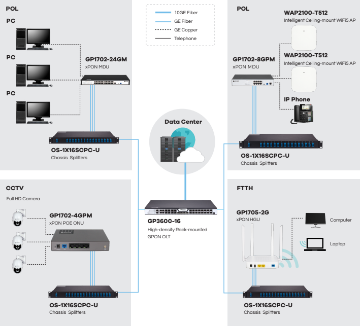 Supports gpon (Downlink 2.5 Gbps/1.25 GBPS Suppink, 1: 128 Splitting ratio) and epon (Downlink 1.25 GBPS/1.25 GBPS Problek, 1:64 Splitting ratio). SC/PC interface.