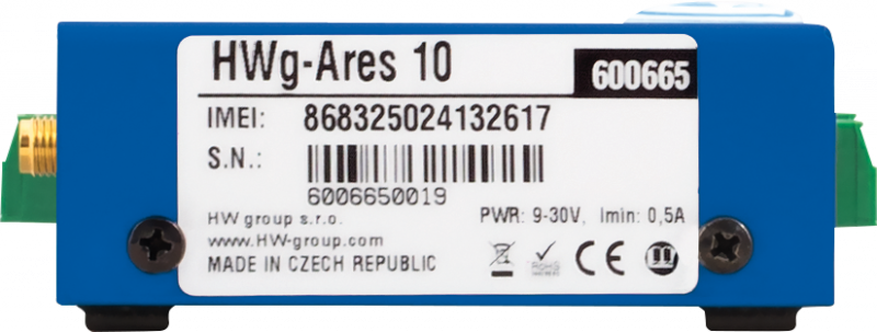 HWg-Ares10 je cenově efektivní GSM teploměr pro vzdálený dohled a odesílání poplachů z míst bez možnosti připojení k LAN, k němuž lze připojit až 6x senzor na 1 Wire a 1Wire-UNI a 2x detektor na DI. Přes on-line aplikaci HWPortal.cz lze HWg-Ares10 konfigurovat a ovládat, rozesílat alarmy či prohlížet grafy hodnot. HWg-Ares10 hlídá rozsahy hodnot připojených senzorů, při alarmové hodnotě posílá e-mail, SMS nebo prozvoní zadaná telefonní čísla. Produkty řady Ares umožňují vzdálenou aktualizaci firmware „FOTA“ (Firmware Over The Air).