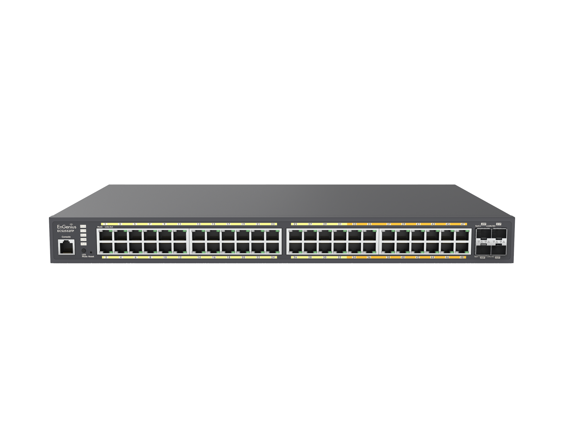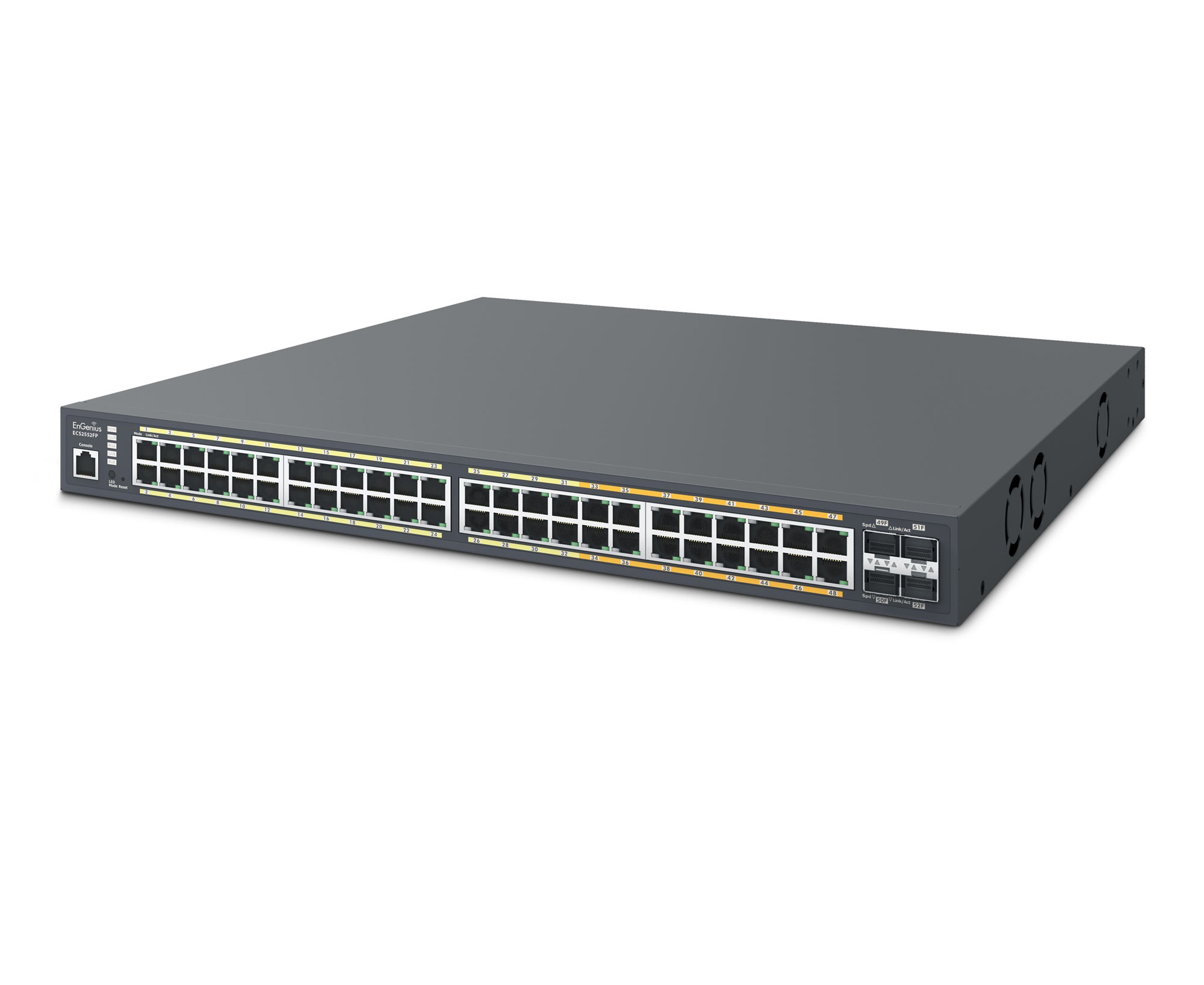 EnGenius ECS2552FP je 48-portový (32x 1G + 16x Multi-G RJ45) PoE Switch s centrální cloudovou správou. Je vybaven možností lokální nebo centrální konfigurace, monitorováním a správou sítě a snadno použitelným webovým rozhraním. Napájí kompatibilní PoE zařízení dle normy 802.3af/at, jako jsou IP kamery, VoIP telefony a AP. Celkový power budget je 740 W.