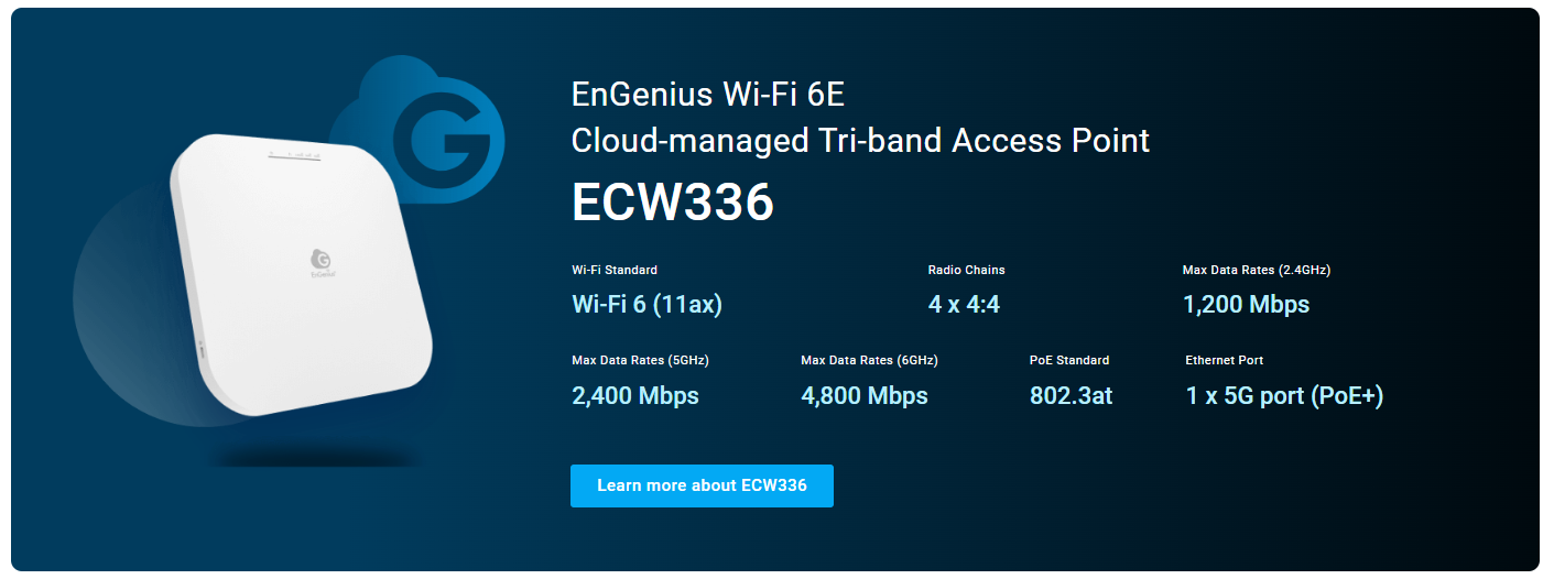 Třípásmový přístupový bod EnGenius ECW336 je zvláště vhodný pro použití v podnikových vnitřních prostředích. Poskytuje rychlé a spolehlivé Wi-Fi pokrytí v pásmech 2,4 GHz, 5 GHz a 6 GHz s podporou nejnovější WiFi 6E, přenosovou rychlost až 8400 Mbps, 4×4:4 MU-MIMO, TX Beamforming, patentovaná technologie Mesh.