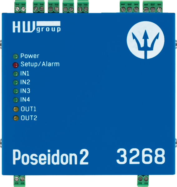 Poseidon2 3268 umožňuje připojení až 8 senzorů přes sběrnici 1-Wire UNI/1-Wire a až 4 detektorů přes binární DI vstupy. Prostřednictvím Poseidon2 3268 lze ovládat 2 DO relé výstupy NO/NC, případně až 8 virtuálních digitálních výstupů (VDO) na vzdálených jednotkách Poseidon2 nebo Damocles2 (M2M)