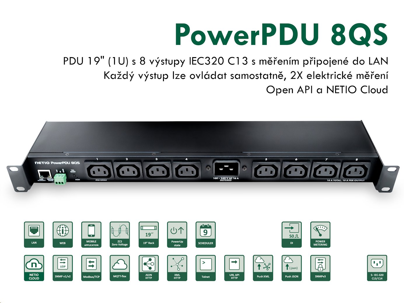 The 8QS PowerPDu contains open M2M API , individual outputs can be measured and controlled using 10 different M2M protocols. Smart Netio sockets can be connected to multimedia AV systems, various cloud services (eg MS Azure IoT Hub), Node-Red environment or smart houses.
