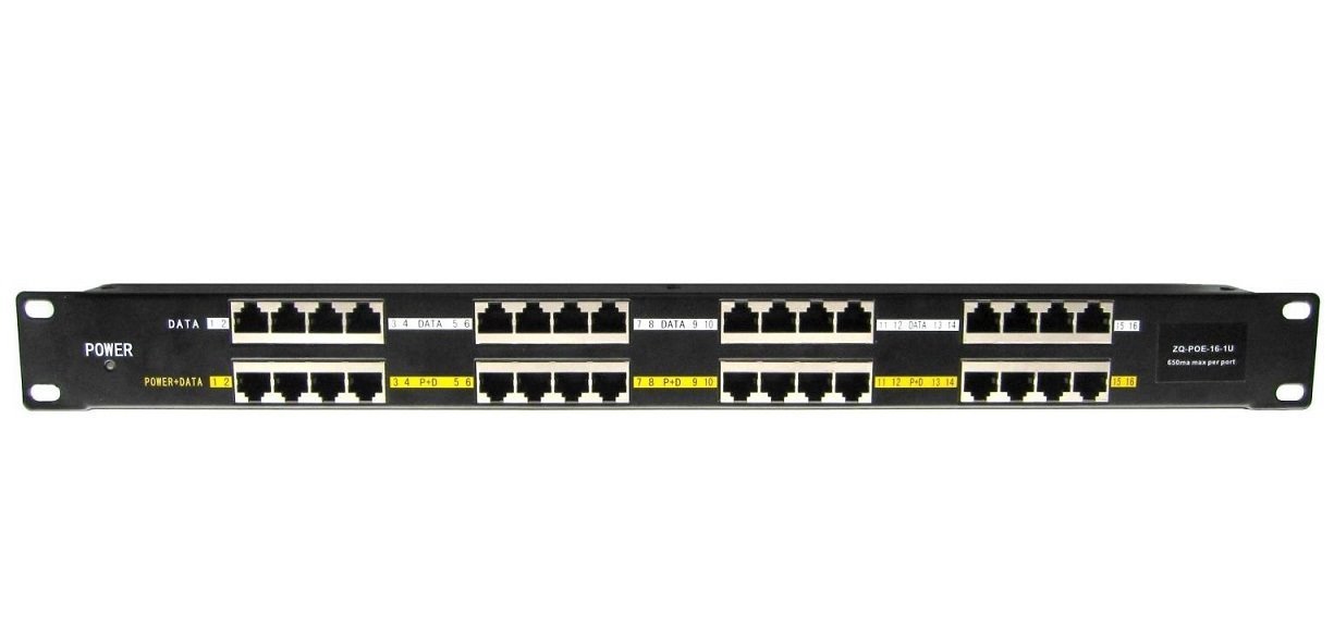 PoE panel 19", mounted, shielded, 16 x RJ45, passive PoE injector