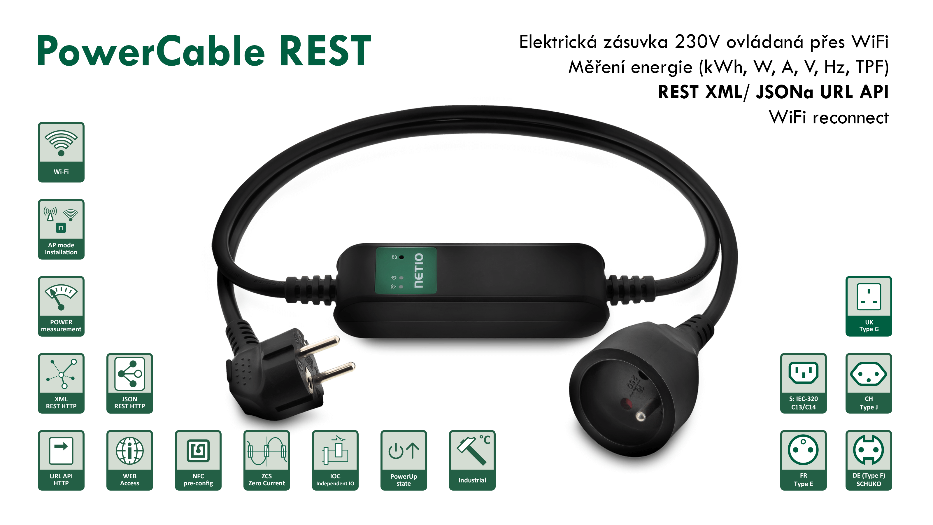 Netio PowerCable Rest 101e is a wifi socket to integrate into a third-party system using an open API. PowerCable is a smart socket in the design as an electric extension cable with WiFi connection to the rope network. You can view the electricity consumption measurement values via the web interface and turn off/off the output electrical outlet.