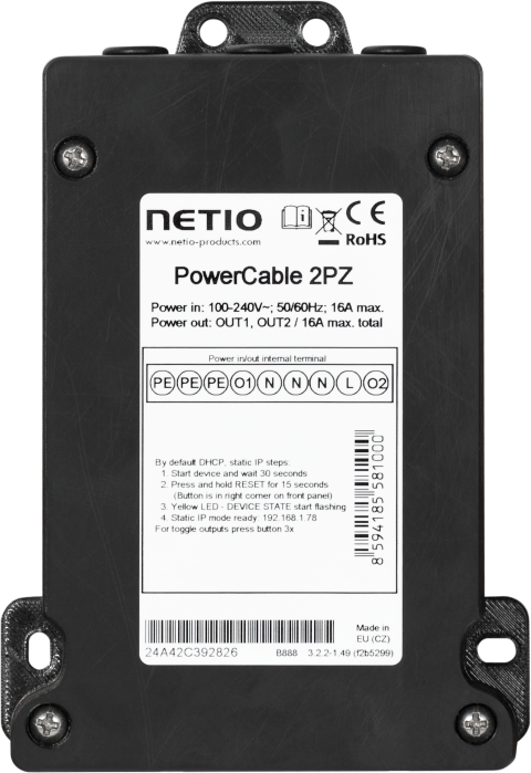 Netio Powerbox 2PZ is on LAN and WiFi controlled smart PDUs 2 outputs . Each output can be turned on and off via the product interface. The materials and temperature ranges of the equipment predetermine for use in industries. With compact dimensions, PDUs can be easily installed, for example, for screens, ceilings or other less accessible places.