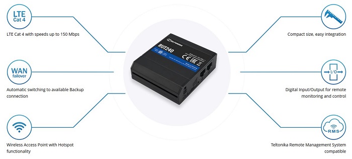 SMA konektory pro připojení externích antén dovolují anténu umístit na vhodné místo k dosažení co možná nejvyšší úrovně přijímaného signálu. RUT240 podporuje špičkové bezpečnostní funkce a je často používán jako 4G záloha. Vzdálené připojení, Out-of-Band management, pokročilé VPN funkce a podpora tunelů z něj dělá ideální zařízení pro IoT sítě.