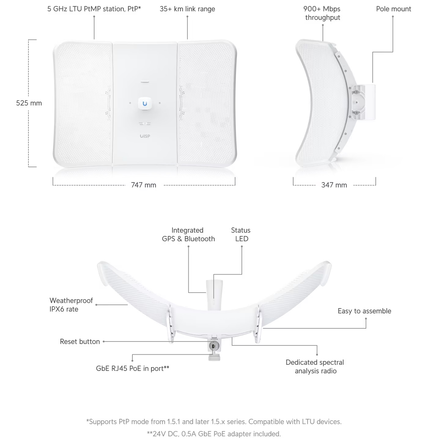UBNT LTU Extreme-Range je PtMP klientská jednotka pro 5GHz pásmo s anténním ziskem 29 dBi a proprietární bezdrátovou technologií LTU, která není postavena na limitovaném standardu 802.11, čímž lze dosáhnout reálné TCP/IP rychlosti 550 Mbps+.Další informace