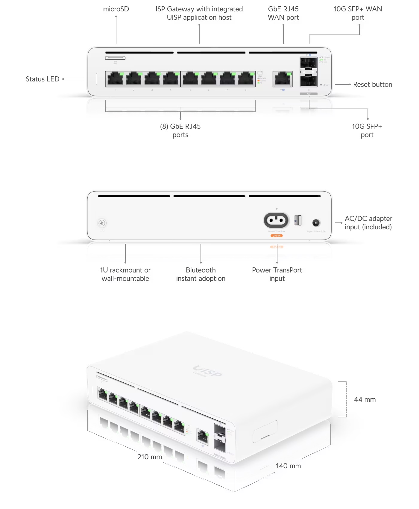 UBNT UISP Console je router s 9x Gigabit LAN a 2x SFP+ porty, z čehož 1x Gigabit LAN a 1x SFP+ jsou určeny pouze jako WAN. Přenosová rychlost dosahuje 10 Gbps.Další informace
