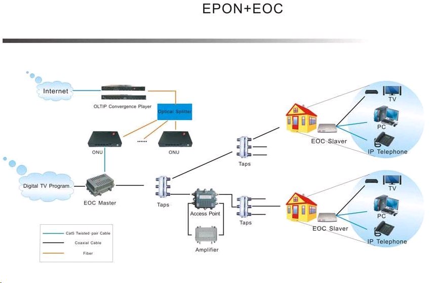 Pro aplikaci počítačové sítě EOC obsahuje Head End jednotku nazývanou Master, která spojí signál TV s daty sítě Ethernet do koaxiálního mixed signálu a koncovou jednotku nazývanou Slave. Jeden Master může obsloužit až 128 Slave jednotek, síťová struktura může být hvězda anebo strom (síťová struktura může být hvězda anebo strom)