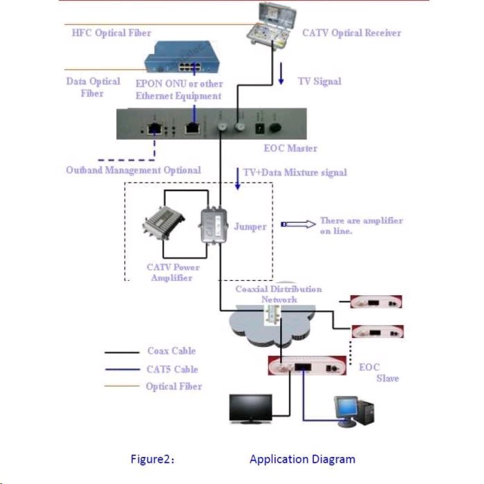 Pro aplikaci počítačové sítě EOC obsahuje Head End jednotku nazývanou Master, která spojí signál TV s daty sítě Ethernet do koaxiálního mixed signálu a koncovou jednotku nazývanou Slave. Jeden Master může obsloužit až 128 Slave jednotek, síťová struktura může být hvězda anebo strom (síťová struktura může být hvězda anebo strom)